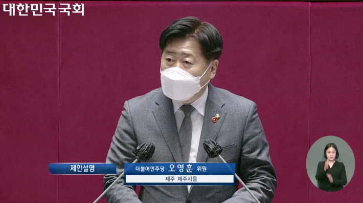 오영훈 국회의원(민주당, 제주시을)이 26일 국회 본회의에서 4.3 희생자와 유족을 위로할 내용이 담긴 제주 4.3 특별법 개정안을 제안설명하고 있다. 국회인터넷의사중계시스템 캡처