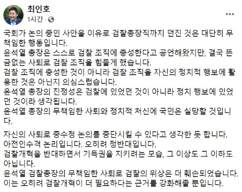 최인호 "국회가 논의 중인 사안을 이유로 총장직 던진 건 무책임"
