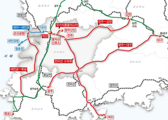 전주-김천간 철도와 국가식품클러스터 산업선, 전라선 고속화, 새만금-목포, 달빛 내륙철도 건설 그리고 익산역 유라시아 거점역 선정 등이다.