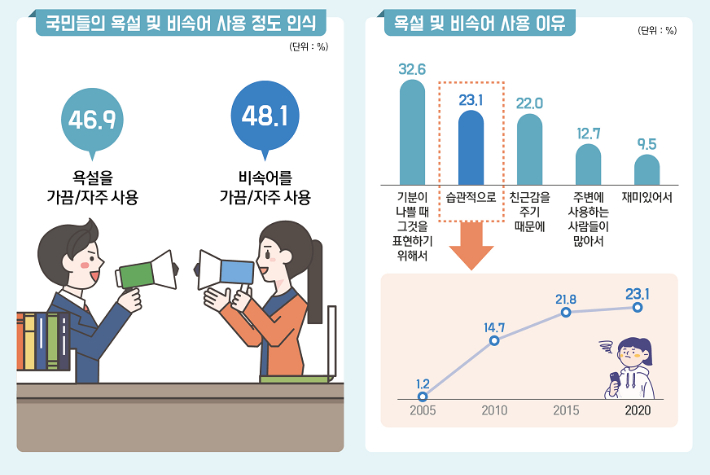 욕설·비속어를 사용하는 이유로는 32.6%가 '기분이 나쁜 것을 표현하기 위해서', 23.1%는 '습관적으로', 22.0%는 '친근감의 표현'이라고 답했다. 지난 2005년 조사 결과와 비교하면 '기분이 나쁜 것을 표현하기 위해서'라는 응답은 55.6%에서 32.6%로 크게 줄었으나, '습관적으로'라는 응답은 1.2%에서 23.1%로 크게 올랐다. 국립국어원은 "온라인 소통이 일상화된 상황에서 욕설과 비속어가 쉽게 전파되고, 일상적으로 이런 말들을 접하게 되면서 문제의식 없이 습관적으로 욕설과 비속어를 사용하는 사람이 늘고 있는 것으로 분석된다"고 설명했다.