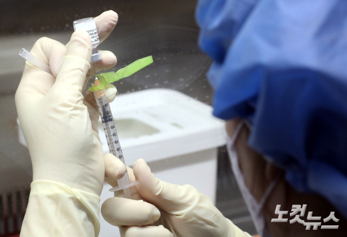 서울 중구 국립중앙의료원 중앙예방접종센터에서 의료진이 코로나19 화이자 백신을 소분해 접종을 준비하는 모습. 사진공동취재단