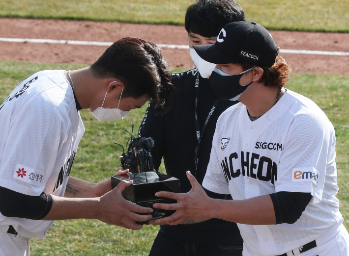 2주간의 자가격리를 마친 추신수는 11일 부산 사직구장에서 열린 KBO 리그 롯데 자이언츠와 연습경기가 끝난 뒤 진행된 상견례 자리에서 투수 이태양(31)에게 선물을 전달했다.