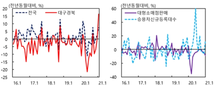 제조업 생산지수 증감률(왼쪽)과 대형소매점.승용차신규등록대수 증감률. 한국은행 대구경북본부 제공