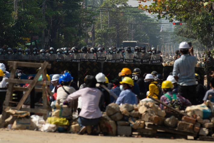양곤에서 군경과 대치 중인 쿠데타 항의 시위대. 연합뉴스
