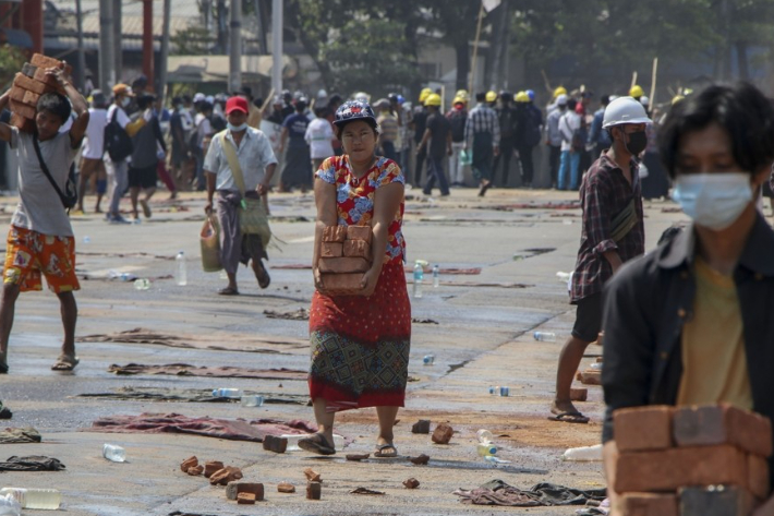 미얀마 반군부 시위대에 벽돌 전달하는 시민들. 연합뉴스