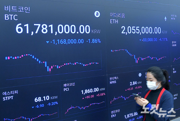 비트코인 거래 가격이 한 때 6300만원을 넘으며 현재 6100만원 선에서 등락하고 있는 가운데 10일 오후 서울 강남구 업비트 라운지 전광판에 지수가 표시돼 있다. 박종민 기자