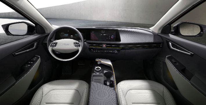 EV6의 실내 디자인 중 가장 먼저 눈에 들어오는 것은 전면부를 매끄럽게 감싸듯 자리한 파노라믹 커브드 디스플레이다. 넓게 펼쳐진 화면과 슬림하게 자리한 대시보드는 시각적 확장감을 극대화하면서도 차량의 내부를 더욱 넓어 보이게 한다.