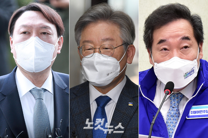 (왼쪽부터)윤석열 전 검찰총장, 이재명 경기도지사, 더불어민주당 이낙연 상임선대위원장. 이한형·윤창원 기자