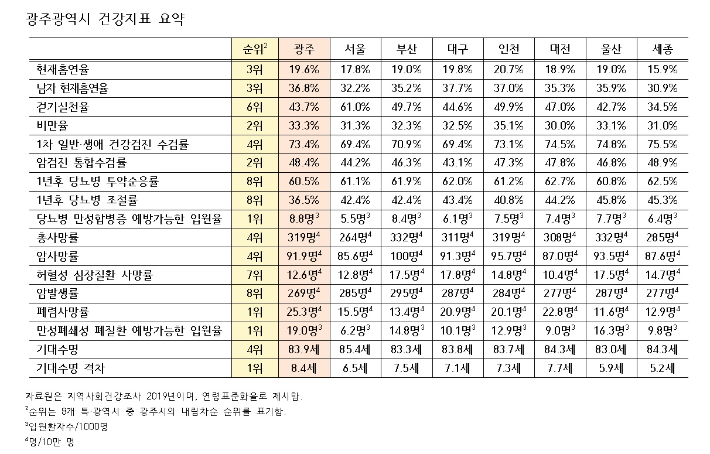 비만율의 경우 광주가 33.3%로 인천(35.1%)에 이어 2번째로 높은 것으로 나타났고, 흡연율(19.6%)과 남자 흡연율(36.8%)은 각각 3번째로 높은 것으로 분석됐다.