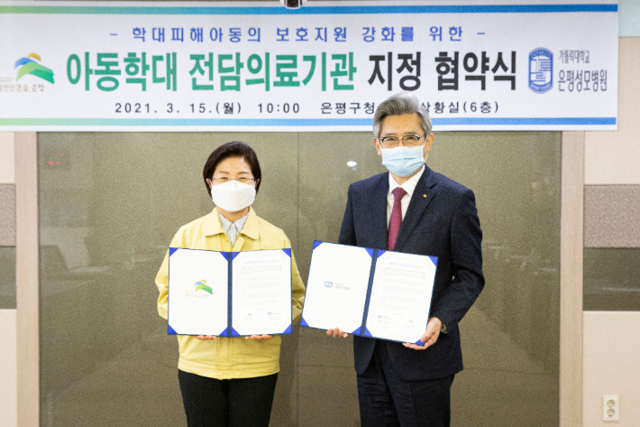 서울 은평구(구청장 김미경)는 15일 서울시 최초로 학대피해(의심)아동의 보호와 아동학대예방을 위한 아동학대 전담의료기관을 지정하고 가톨릭대학교 은평성모병원(병원장 권순용)과 업무협약(MOU)을 체결했다고 16일 밝혔다.