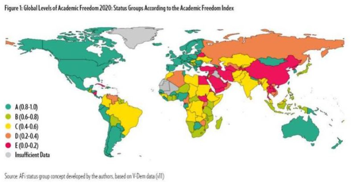 이번 조사에는 연구 및 교육의 자유, 학문적 의사소통의 자유, 학교 자율성, 캠퍼스 완전성, 학문적 및 문화적 표현의 자유의 5개 지표가 고려되었다.