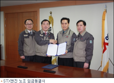 STX엔진은 "이 회사 용인사업장 노조가 올해 임금을 동결키로 하고 이달 13일 정동학 대표이사와 김수열 용인 노조위원장 등이 참석한 가운데 임금동결식을 개최했다"고 16일 밝혔다.