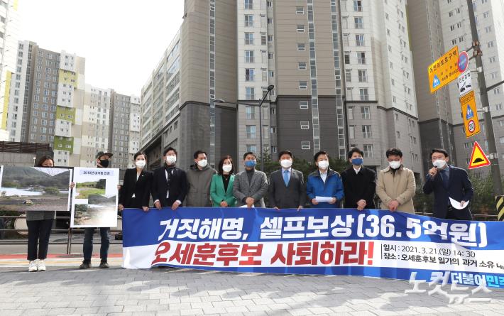 21일 오후 더불어민주당 야당후보검증 태스크포스(TF)팀이 오세훈 서울시장 재임 시절 당시 처가가 소유한 내곡동 땅 부지가 국민임대주택지구 부지로 지정돼 36억원의 보상을 받았다는 의혹이 제기된 내곡동 주택지구를 둘러 본 후, 천준호 의원이 발언을 하고 있다.