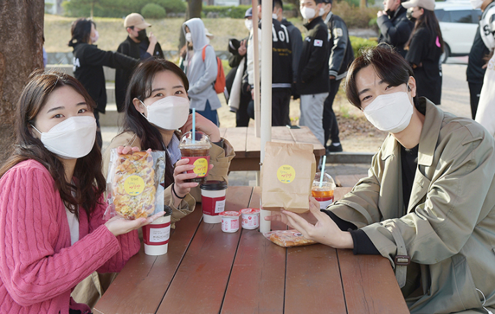 순천향대가 천원으로 아침식사를 할 수 있는 '천원의 아침밥'사업을 진행하고 있는 가운데 학생들이 야외 벤치에서 간편한 아침식사를 즐기고 있다. 순천향대 제공