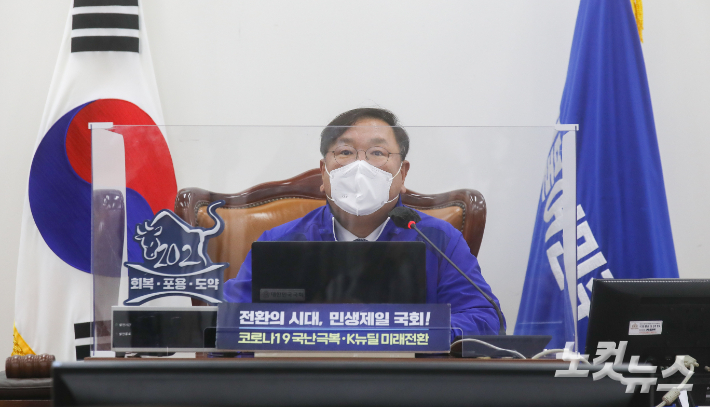 김태년 더불어민주당 대표 직무대행이 24일 오후 서울 여의도 국회에서 열린 화상 의원총회에서 모두발언을 하고 있다. 윤창원 기자
