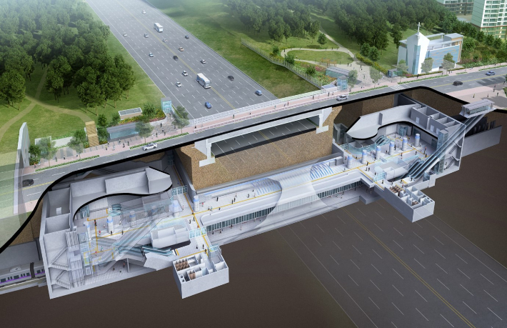 강일역은 수도권제1순환고속도로 바로 아래에 위치한 난공사 구간으로 안전 확보를 위해 추가 구조물 설치 등 정밀시공을 시행하느라 1단계 개통 이후에도 무정차 통과하여 아쉬움이 컸었다.