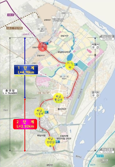 지하철 5호선 연장(하남선) 공사는 상일동역을 기점으로 강일역을 거쳐 하남시미사~하남풍산~하남시청~하남검단산역까지 총 7.7km 구간에 5개역을 신설하는 공사다.