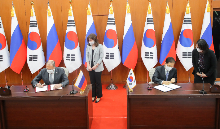 정의용 외교장관(오른쪽)과 세르게이 라브로프 러시아 외무장관이 25일 서울 종로구 도렴동 외교부 청사에서 열린 한-러 외교장관회담을 마친 뒤 협정서에 서명하고 있다. 연합뉴스