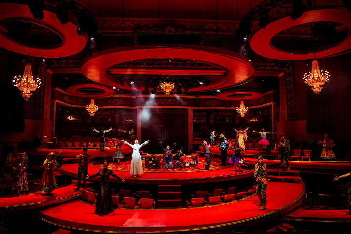 여기저기서 튀어나오는 액터 뮤지션의 악기 소리가 어깨를 들썩이게 한다. 일렉트로닉 음악이 흐르는 장면에서는 클럽에 온 듯 신난다. 배우들이 실제 맥주잔을 부딪친다. 그때그때 장면 분위기에 맞춰 색색깔의 옷으로 갈아입는 조명이 흥을 배가시킨다. 도우넛 모양 조명에 매달린 샹들리에도 멋스럽다.
