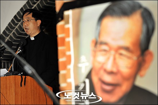 [BestNocut_R]''한국 천주교의 큰 별'' 김수환(金壽煥) 추기경이 향년 87세의 나이로 선종(善終)한 가운데 16일 저녁 서울 명동성당 문화관에서 열린 장례위원회 기자회견에서 허영업 신부가 장례 절차를 설명하고 있다.