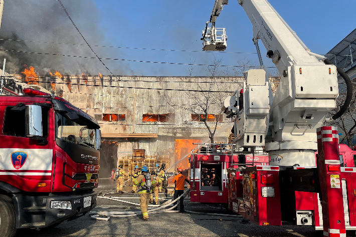 이날 오후 6시 13분 큰불길은 잡았지만, 골판지 등 종이 자재가 남아 있어 다음날 오전 5시 35분이 돼서야 완전히 진화했다.