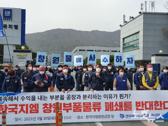 한국GM창원부품물류비정규직지회는 30일 경남 창원에 있는 한국GM 창원공장 앞에서 기자회견을 갖고 "노조와 협의하지 않은 사측의 일방적 물류 폐쇄를 절대 용납할 수 없다"고 밝혔다.