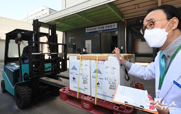 31일 경기도 평택시 오성면 ㈜한국초저온 물류센터에서 관계자들이 화이자와 직접 계약을 통해 확보한 백신 추가 물량 50만 회분을 수송한 백신차량을 살펴보고 있다. 이날 물류센터로 옮겨져 초저온 보관된 백신은 49개소 접종센터로 옮겨져 다은달 1일 시작되는 75세 이상 어르신과 노인시설 입소.종사자 접종에 사용될 예정이다.