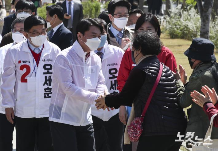 안철수 국민의당 대표가 31일 오후 서울 마포구 경의선숲길공원 인근에서 오세훈 국민의당 서울시장 후보 지원 유세를 펼치며 시민들과 만나고 있다.