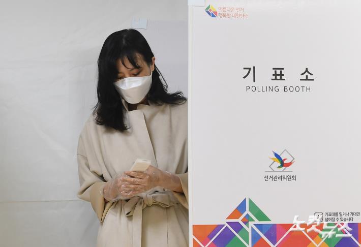 오세훈 국민의힘 서울시장 후보 부인 송현옥 씨가 4.7 재보궐선거 사전투표 둘째날인 3일 오전 서울 광진구 자양3동 주민센터에 마련된 사전투표소에서 투표한 뒤 기표소를 나서고 있다.