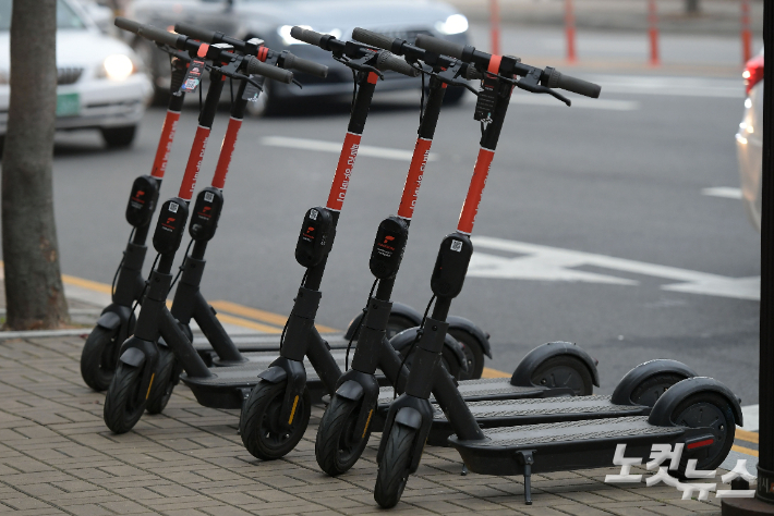 공유 전동 킥보드들이 주차돼 있다. 이한형 기자