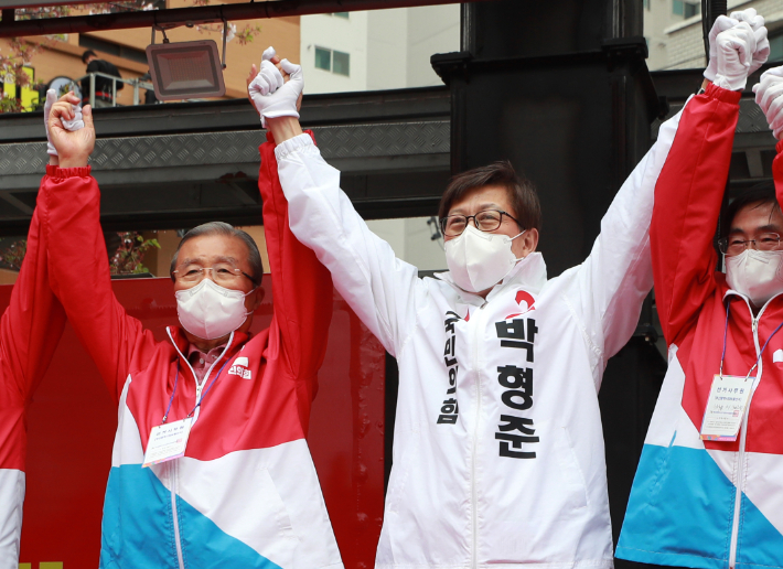 국민의힘 박형준 부산시장 보궐선거 후보가 4일 오후 부산 남구 LG메트로시티 앞 사거리에서 열린 유세에서 김종인 비상대책위원장과 함께 손을 맞잡고 지지를 호소하고 있다. 연합뉴스