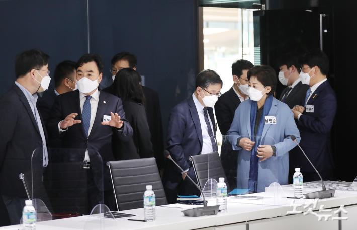 14일 오전 서울 여의도 국민일보 빌딩에서 열린 더불어민주당 의원모임 '더좋은미래'의 비공개 전체회의에 김기식 더미래연구소장(왼쪽부터), 윤관석, 김성환, 남인순 의원들이 참석, 대화하고 있다.