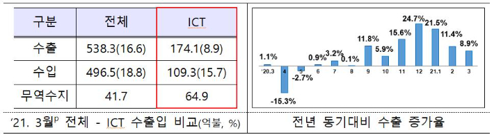 과학기술정보통신부는 3월 정보통신기술(ICT) 수출액이 174억 1천만 달러, 수입액이 109억 3천만 달러, 무역수지는 64억 9천만 달러 흑자로 잠정 집계됐다고 14일 밝혔다.