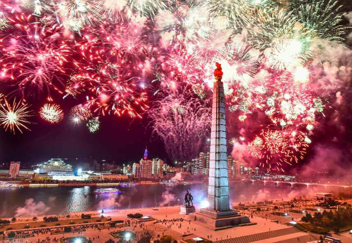 김일성 생일 축하하며 평양 시내에 펼쳐진 축포. 뉴스1 제공