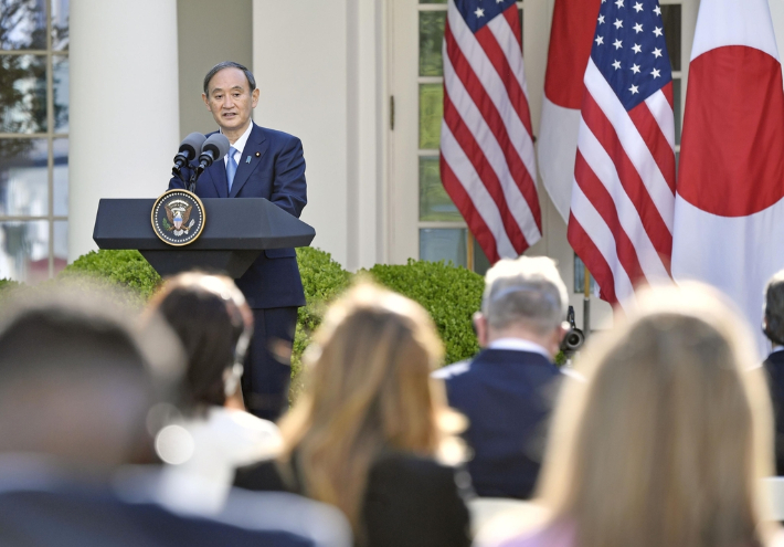 스가 요시히데(菅義偉) 일본 총리가 현지시간 16일 오후 미국 백악관에서 열린 조 바이든 미국 대통령과의 공동 기자회견에서 발언하고 있다. 연합뉴스