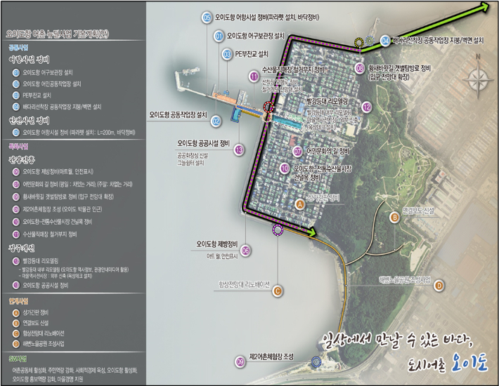 지난해 2월 지방어항으로 지정·고시된 오이도항에는 '지속가능한 도시어촌' 구축이 추진된다. '지방어항 개발사업'과 '어촌뉴딜 300사업'이 핵심이다.