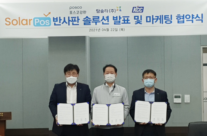 포스코 강판은(윤양수 대표이사 사장)은 22일 탑솔라 본사에서 탑솔라, KCC와 태양광 반사판 공동 개발 협약을 체결했다.