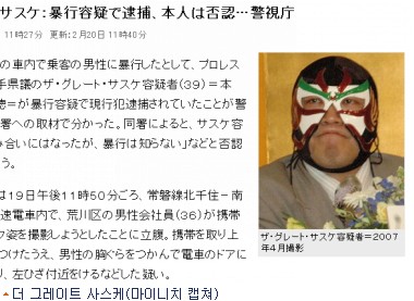 마이니치 신문은 20일 자에서, 지하철에서 승객을 폭행한 프로 레슬러 더 그레이트 사스케(39)를 경찰이 현행범으로 체포했다고 보도했다.