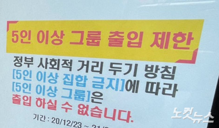 한 식당에 5인 이상 출입을 제한하는 안내문이 붙어있다. 황진환 기자