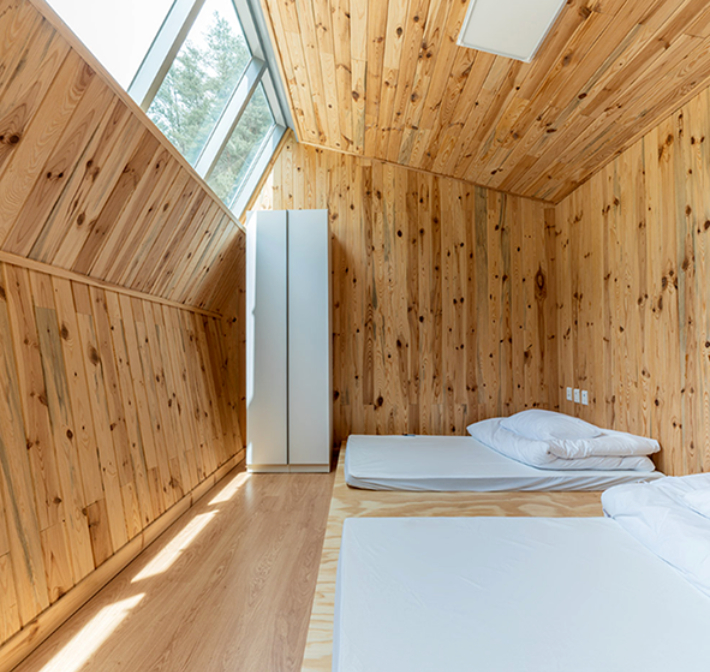 수련동으로 불리는 숙소는 내부가 금강소나무로 마감 처리돼 문을 열고 들어가면 은은한 소나무향을 맡을 수 있다. 밤에는 누워서 별을 감상할 수 있게 특수 창문을 설치했다. 방 안에는 취사 공간은 물론 TV도 없다.