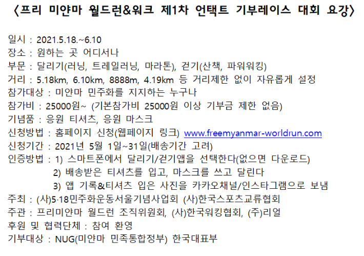 프리 미얀마 월드런&워크 제1차 언택트 기부레이스 대회 요강. (사)5·18민주화운동서울기념사업회 제공.