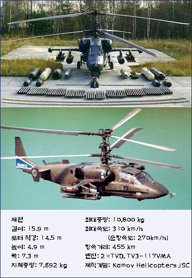 하지만 러시아는 카모프(Ka-50·블랙샤크)와 해벅(Mi-28) 등 2∼3종의 공격헬기를 보유중이며 성능은 미국의 아파치(AH-64) 헬기와 대등한 것으로 알려졌다.