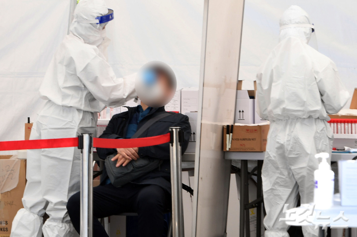 코로나19 선별검사소에서 의료진이 검체 채취를 하고 있다. 황진환 기자