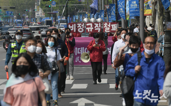 지난해 5월 1일 민주노총 총연맹 관계자들이 노동절 기념 행진을 하고 있다. 이한형 기자