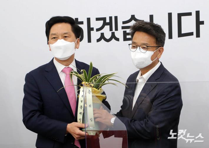 3일 국회에서 이철희 청와대 정무수석이 김기현 국민의힘 당대표 권한대행을 예방해 축하난을 전달하고 있다.