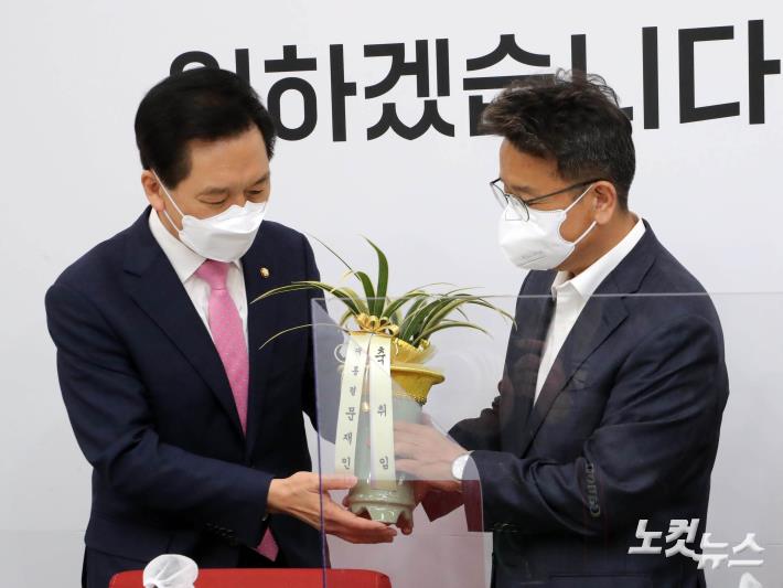 3일 국회에서 이철희 청와대 정무수석이 김기현 국민의힘 당대표 권한대행을 예방해 축하난을 전달하고 있다.