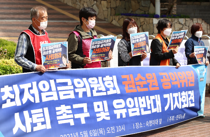 민주노총 관계자들이 6일 오전 서울 용산구 숙명여자대학교 앞에서 최저임금위원회 권순원 공익위원 사퇴 촉구 기자회견을 하고 있다. 연합뉴스