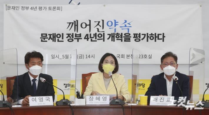 장혜영 정의당 정책위의장(가운데)이 7일 오후 국회에서 열린 '깨어진 약속 문재인 정부 4년의 개혁을 평가하다' 토론회에서 인사말을 하고 있다.