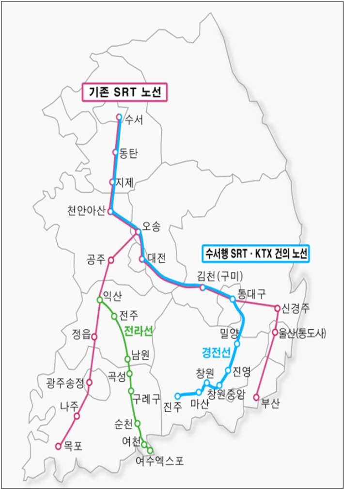 2016년 개통한 SRT는 경부선과 호남선만 운행하고 있다. 경남에서 KTX를 타고 서울 강남과 경기 동남부 지역으로 가려면 동대구역에서 수서행 SRT로 갈아타거나 서울역 또는 광명역에서 내려 버스나 지하철 등을 타고 1시간가량 더 이동해야 한다.
