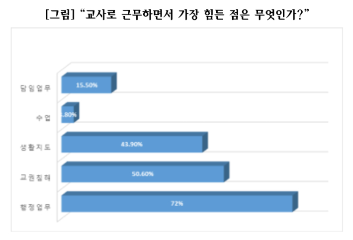 가장 힘든 점(2개 복수 선택)을 묻는 질문에는 △행정업무 70.2% △교권침해 50.6% △생활지도 43.9% 순으로 조사됐다. 수업이나 담임 업무 때문에 힘들다고 답한 교사는 각각 3.8%와 15.5%였다.